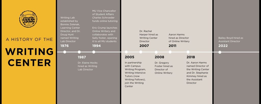 The timeline below chronologically illustrates significant moments at the Writing Center over the last 50 years.